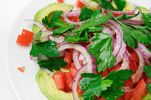 1 Avocado cut in 6 pieces - lengthwise 1 red onion, cut in thinly slices 2 tomatoes chopped, seeds removed As needed 2 or 3 tablespoons of parsley or cilantro leaves (washed and pat dry) As needed Salt and pepper to taste As needed olive oilInstructions