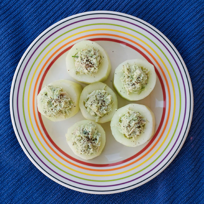 Cucumber cups: For a heartier snack, fill cucumber “cups” with hummus, egg salad or chicken salad. Peel cucumber, slice into 1 ½ inch sections and scoop out the inside with a melon baller. Add a spoonful of your favorite filling. My favorite is avocado chicken salad.
