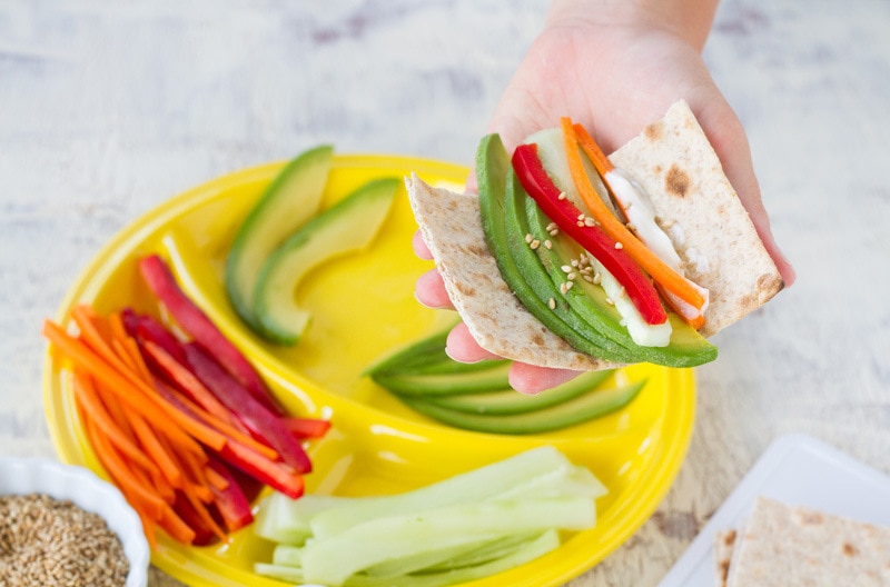 If you’re kids aren’t fans of nori (though I am always surprised that almost all of my kids’ friends will eat it when they see my girls gobbling it down!), you can use some lavash or soft tortillas, cut into small rectangles, instead. These are thicker, but are still delicious.
