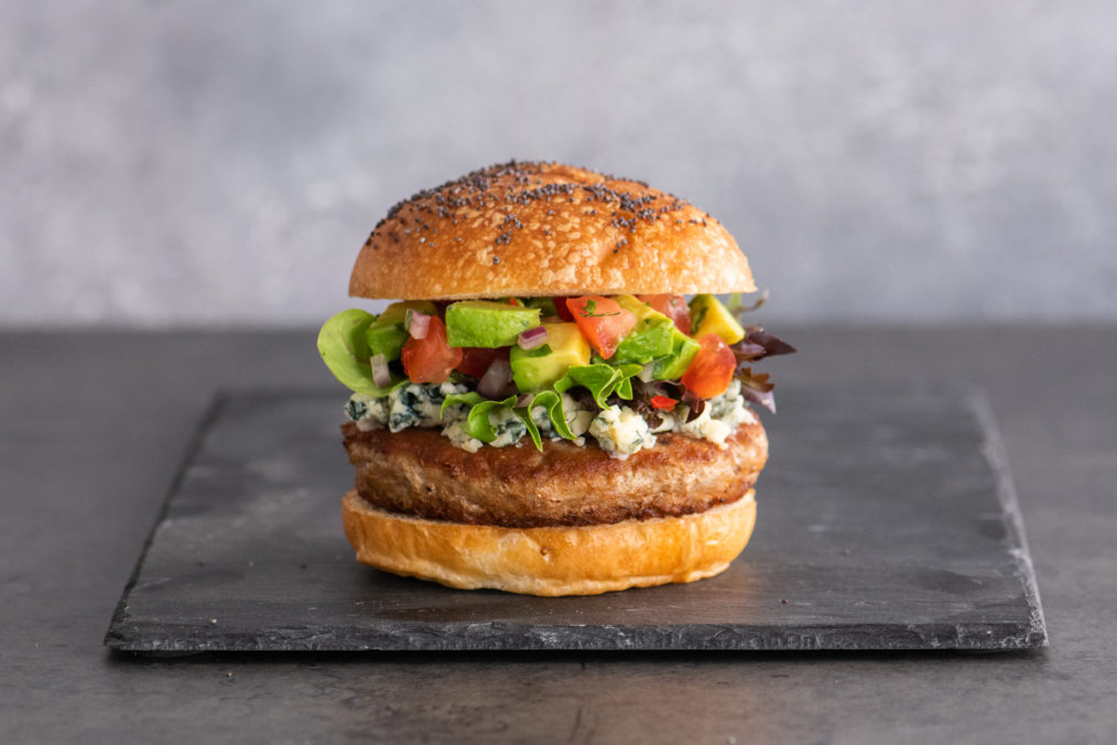 A kicky California Avocado salsa is the hero of these chicken or turkey burgers, which are served on Kaiser rolls with baby lettuces. Blue cheese is an optional topping.