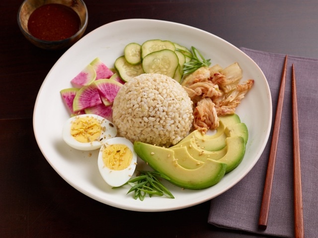 - Place 1 cup of rice into each serving dish/bowl, shaping as you desire. Season each mound of rice with 1 oz. of the Fresh Tare Sauce and top each with 1 tablespoon of the Foundation Furikake. Surround the rice with ½ cup soy-pickled cucumbers, ½ cup watermelon radish slices, ½ cup California Kimchi, ½ sliced Fresh California Avocado, 2 tablespoons of sliced green onions, and one egg sliced into wedges. Serve immediately.