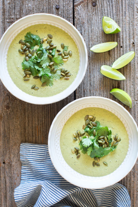 When it’s hot out, chilled soups are a perfect lunch or light dinner when paired with a simple side salad. This Chilled Avocado & Roasted Poblano Soup is a pale green elixir infused with the complex and global flavors. Start with a whole poblano chile and halves of yellow onion sitting below a broiler until smoky and blackened. The charred aromatics are then cooled and blended with a ripe California Avocado, vegetable stock, cilantro, ground coriander, lime zest and juice, salt and crema. The avocado provides a nutrient-dense body to the soup along with a nutty richness that goes so well with chile, cilantro and lime. Finished with cilantro leaves and roasted pepitas, this chilled soup is light, bright and so darn refreshing. Especially on a blazing summer day!