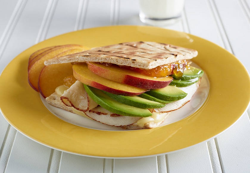 If you love sweet and savory flavors, you’ll love this grilled flatbread sandwich layered with Fresh California Avocado, deli meat chicken and fresh peaches. It’s summer on a sandwich. And you can feel good about eating this sweet treat because it is loaded with nutrition including an excellent source of protein and vitamin C at 50% Daily Value (DV), along with potassium, calcium, iron, dietary fiber, and vitamins C, B6, B5 and K.