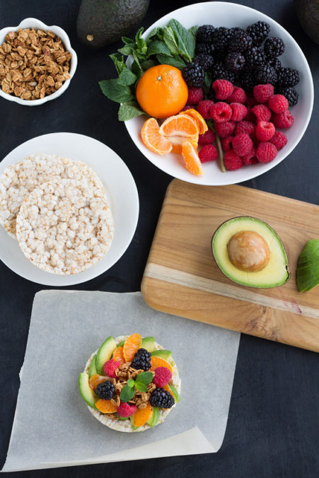 - Top each rice cake with 1/4 of the avocado slices, then mandarin orange slices and 1 tablespoon of granola. Arrange blackberry and raspberries halves on top, then finish each with a fresh mint leaf. Serve immediately!
