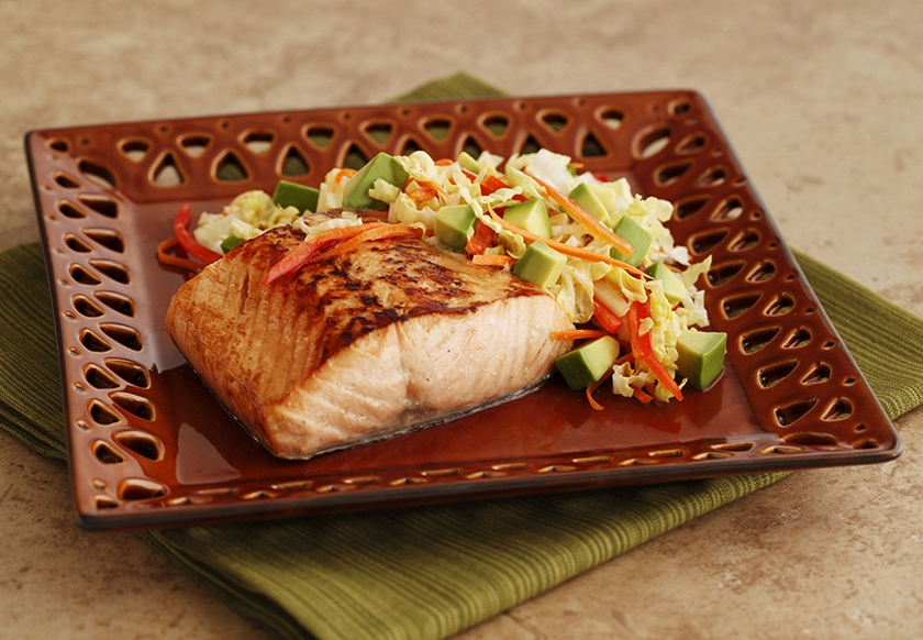 A simple Asian marinade makes a beautiful glazed salmon and doubles as the dressing for delicious California Avocado Slaw.