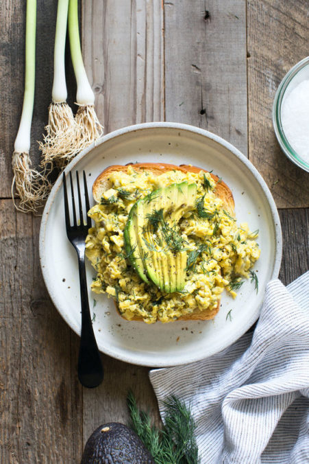 Green Garlic Scrambled Eggs with Avocado and Dill Recipe