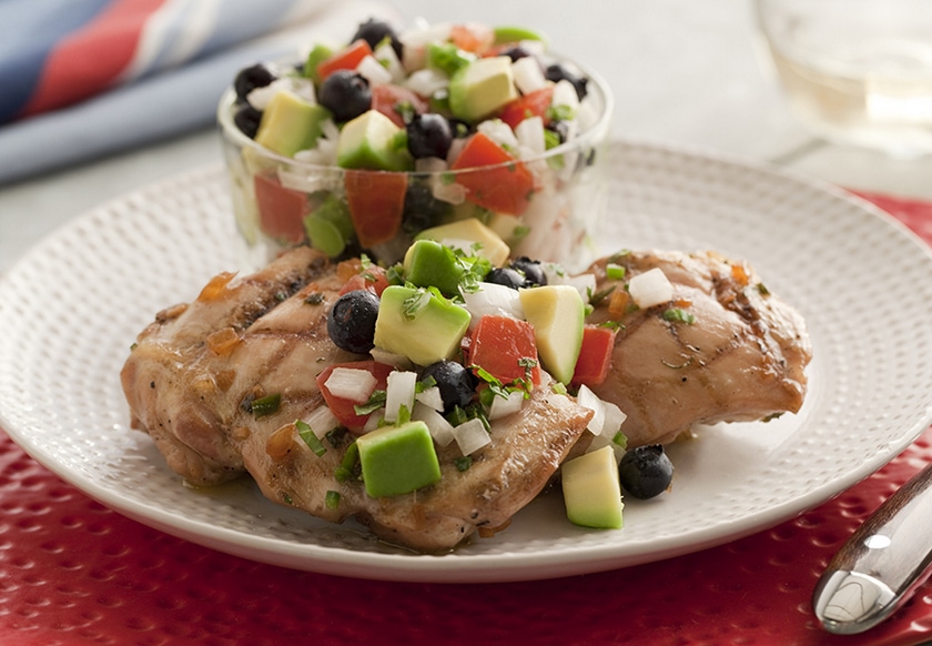 Add some color to your 4th of July or any summer holiday party menu with savory, marinated grilled chicken topped with a festive fruit salsa. Good source of Vitamins A, C and Iron.