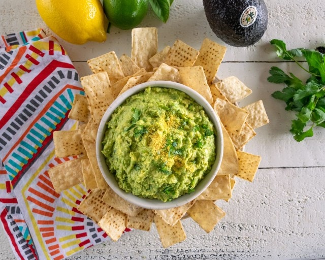 The Husbands That Cook invented a new vegan avocado guacamole with two different citrus fruits and nutritional yeast (also known as “nooch”) that add a slightly nutty and cheesy flavor to the dip. Wonderful!