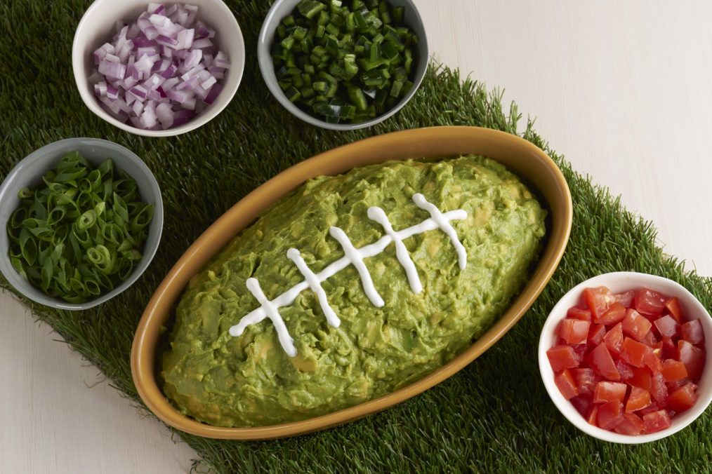 Home Team Guacamole begins with a party size portion of basic guacamole (4 avocados, salt, lemon or lime juice) served in the center of a serving tray. Line up color-coded ingredients around the guacamole in small bowls. Then mix in “add-ins” to personalize and create your own Big Game Day party dip.