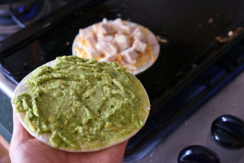 - Lay one of the tortillas on the skillet. Top with cheese and chicken. While it cooks, smear the mashed avocado mixture onto the other tortilla.
