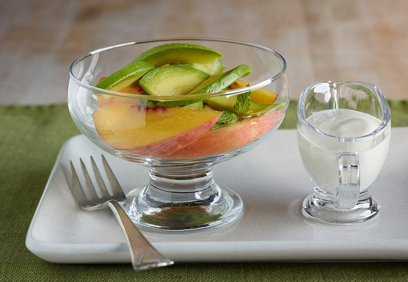 This light, fresh and simple snack or dessert marries avocado and peaches topped with a cottage cheese and honey sauce. Get ready for your taste buds smile with delight and with all that flavor you all get nutrition good nutrition with a good source (10% DV) of Vitamin C, K and Dietary Fiber.