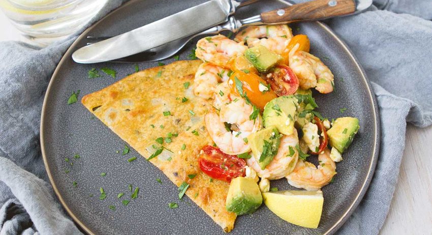 Chunks of creamy California Avocado, filled with heart healthy fats, are the perfect match for the light socca and citrusy shrimp, tomato and feta mixture.