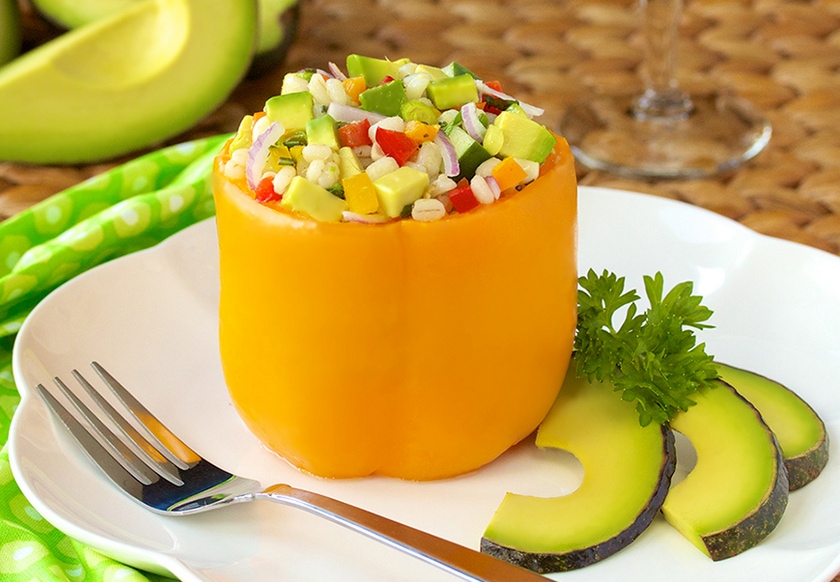 This stuffed pepper recipe is a fabulous twist on tradition. It’s a colorful, edible bowl filled with pearl barley***, red onion, diced cucumber, fresh corn and, of course, wonderful California Avocados. A garlicky-lemon dressing amps up the delightful fresh veggies for delicious flavor in every bite! This cholesterol-free recipe is an excellent source of Vitamin C and a good source of Vitamin A and Iron. The pearl barley in this recipe is a source of protein (3.5g or 7% DV).