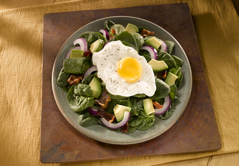 A warm, sunny-side up egg crowns this salad of baby spinach and Fresh California Avocado.