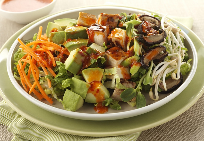 8 each 4-ounce Free Range Skinless Chicken Breasts, grilled and diced 4 Fresh California Avocados, diced 2 each Carrots, peeled and julienned 12 each Shiitake mushrooms, sliced 1 oz. canola oil As needed Salt and pepper 1 bunch Green onions, sliced 4 heads Romaine lettuce, shredded 1/2 cup Mung bean sprouts 1/2 cup Pea sprouts 1/2 bunch cilantro, chopped Dressing: 1 tsp. sesame oil 1 tsp. rice wine vinegar 1 tsp. Fish sauce or salt to taste 1 Tbsp. Miso paste 2 tsp. Sambal chili paste 1 tsp. brown sugar 1 clove garlicInstructions