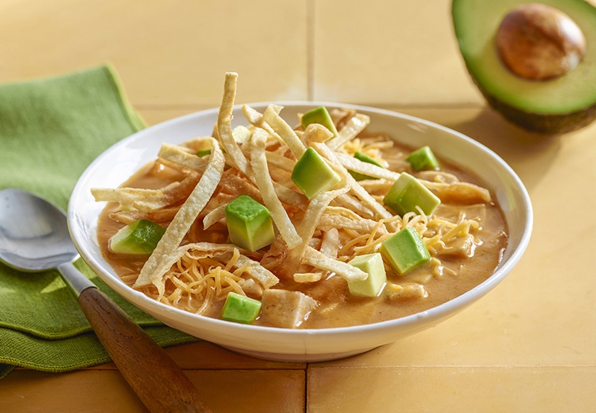 Homemade tortilla soup with garden-fresh ingredients like tomatoes, onions, garlic and chiles and hearty roasted turkey is especially delicious topped with Fresh California Avocados. It’s a great use for leftover Thanksgiving turkey and also can be made with store-bought rotisserie chicken. This Mexican soup is an excellent source of Dietary Fiber (22% DV) and Vitamin B6 (35% DV),