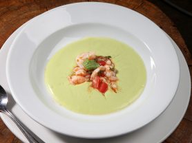 CHILLED CREAMY AVOCADO COCONUT SOUP WITH POACHED SHRIMP